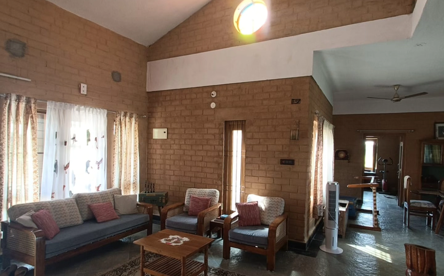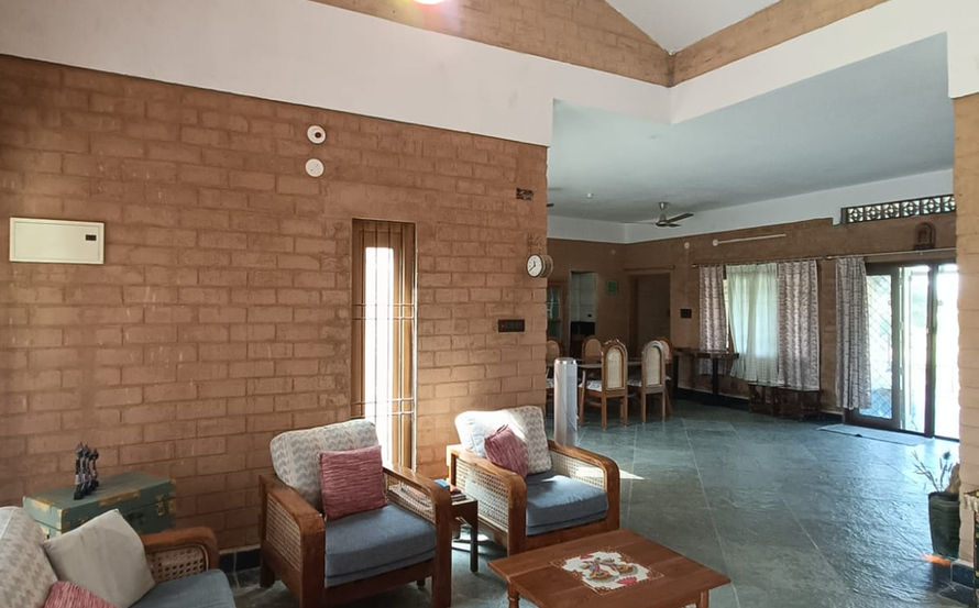 The farmhouse aims to showcase the harmonious union of ecological design and functional elegance. Crafted with compressed stabilized earth blocks (CSEBs), this dwelling stands as a testament to eco-friendly architecture. The farmhouse boasts an open plan that seamlessly integrates with nature, bathing its interiors in natural light and fostering optimal ventilation. Every element, from reused doors and windows to upcycled furniture, narrates a story of conservation and conscious living. Designed for both intimate gatherings and grand celebrations, the farmhouse epitomizes raw sustainability—a haven where the past meets the future in an environmentally conscious embrace.